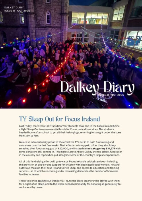Dear Parents/Guardians, Please find attached this week’s issue of the Dalkey Diary. Congratulations to our TY students on their fantastic...